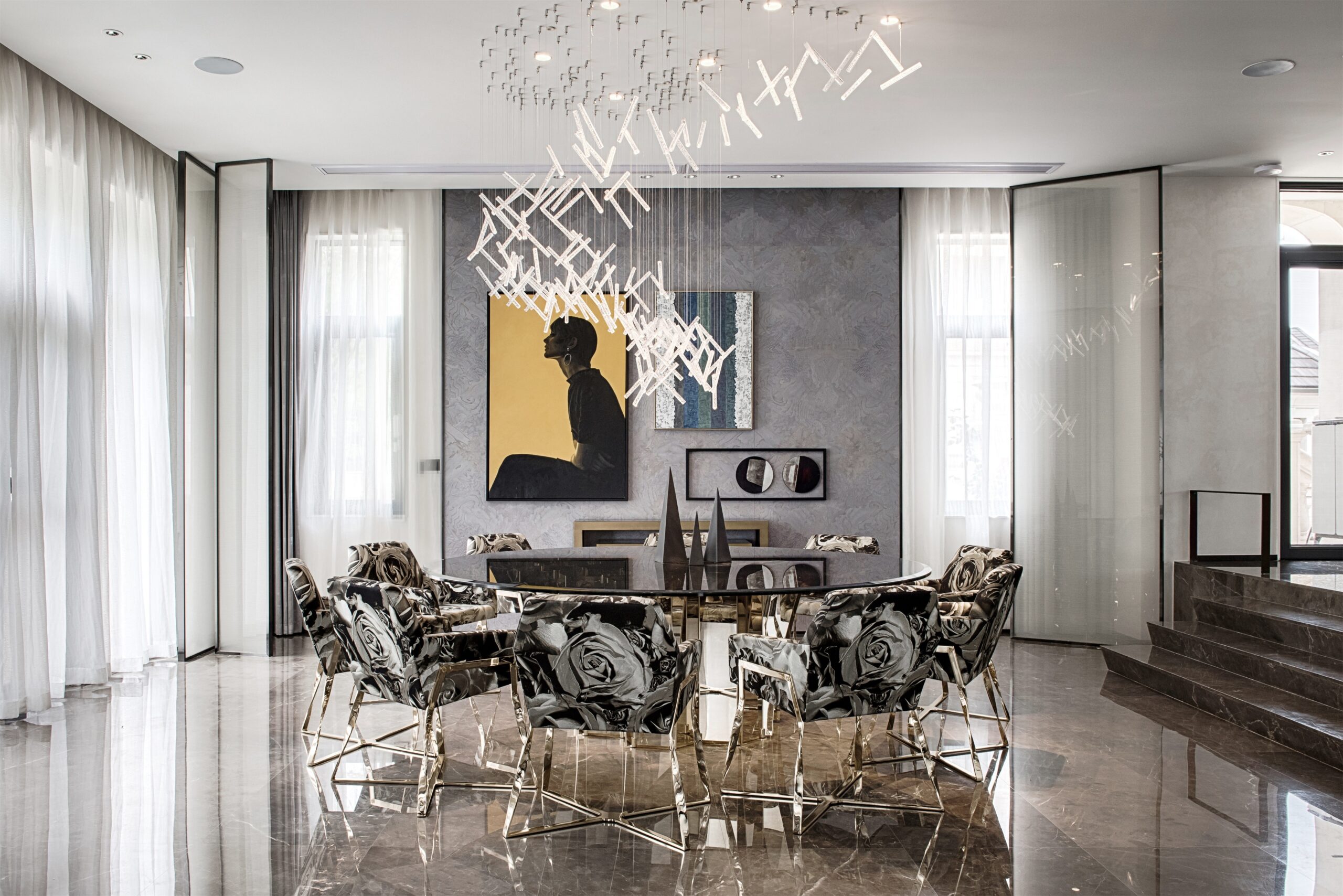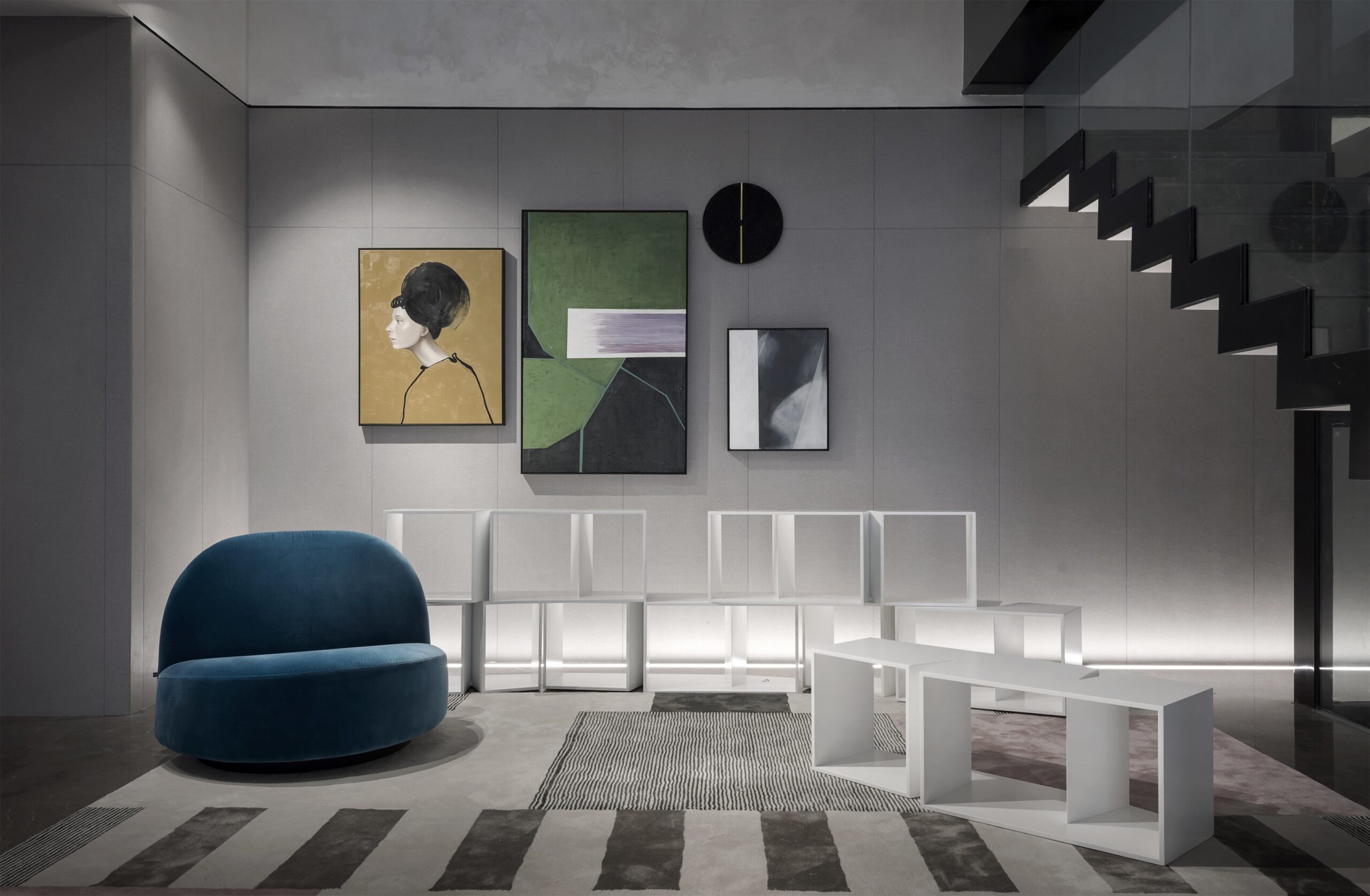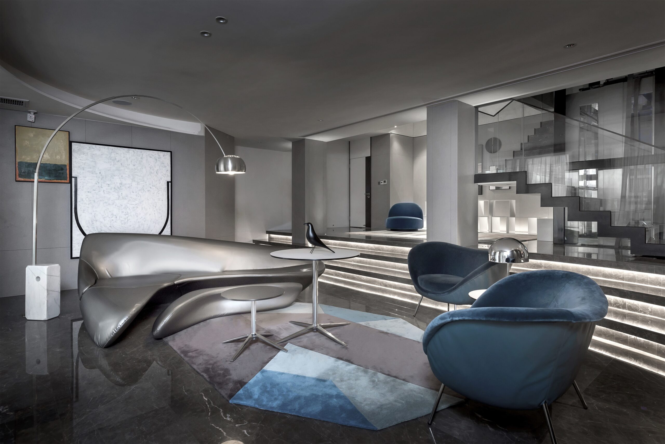 Entering the dark gray environment, the natural luster of the metal connects with the softness of the curved sofa, and the hanging picture in the infinite space in the distance is the opening commentary to the hostess’s freedom. What comes into view with the pace is the momentary freeze of pure collision and brilliance, which is the most exquisite brushwork of this private museum. The encounter of gray and bright colors makes every scattered space an exquisite collection. The gray tone color and free-growing soft decoration become the essence of the collection exhibits. This moment is not only fun, but more pleasant of visual pleasure.