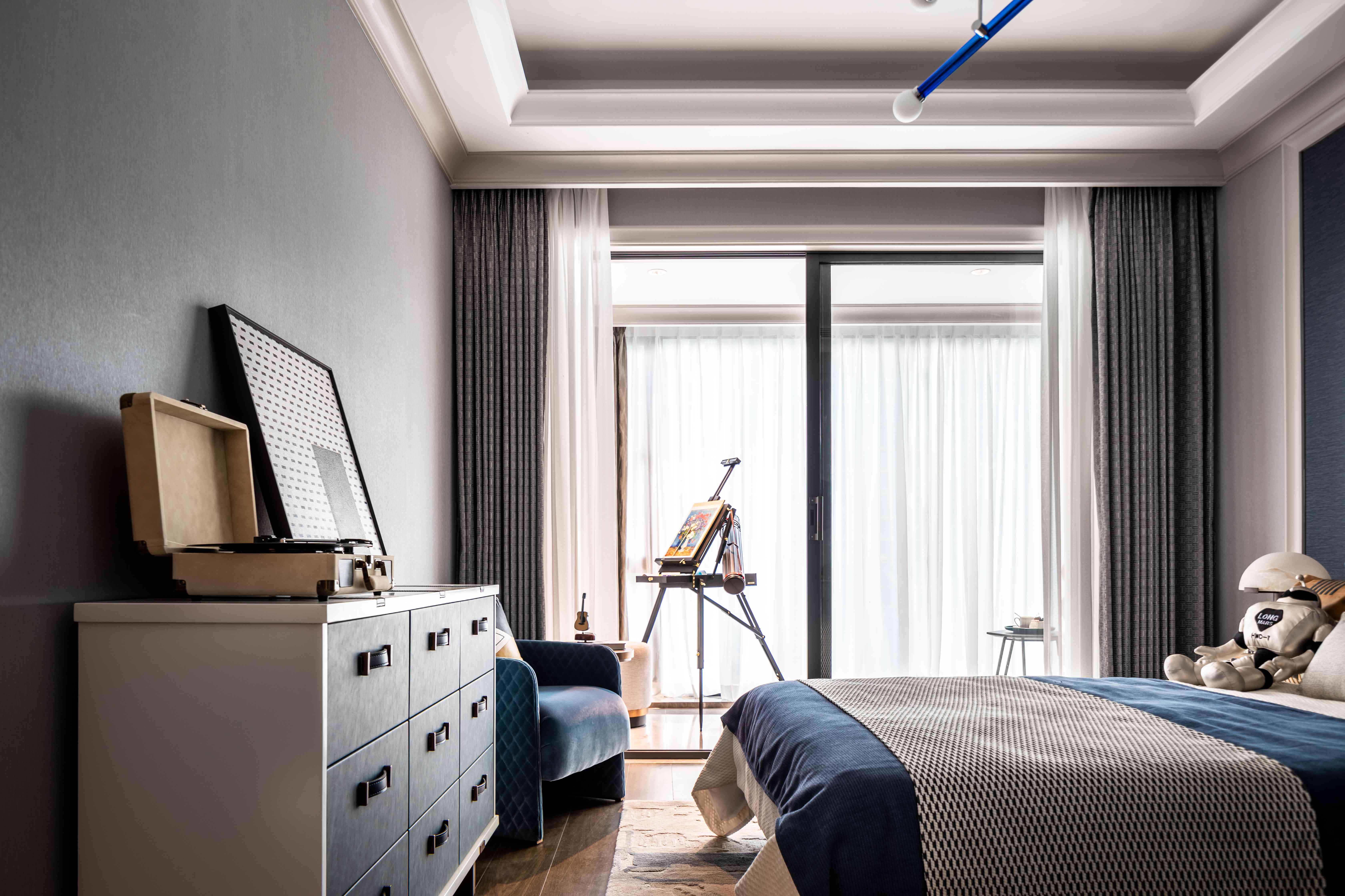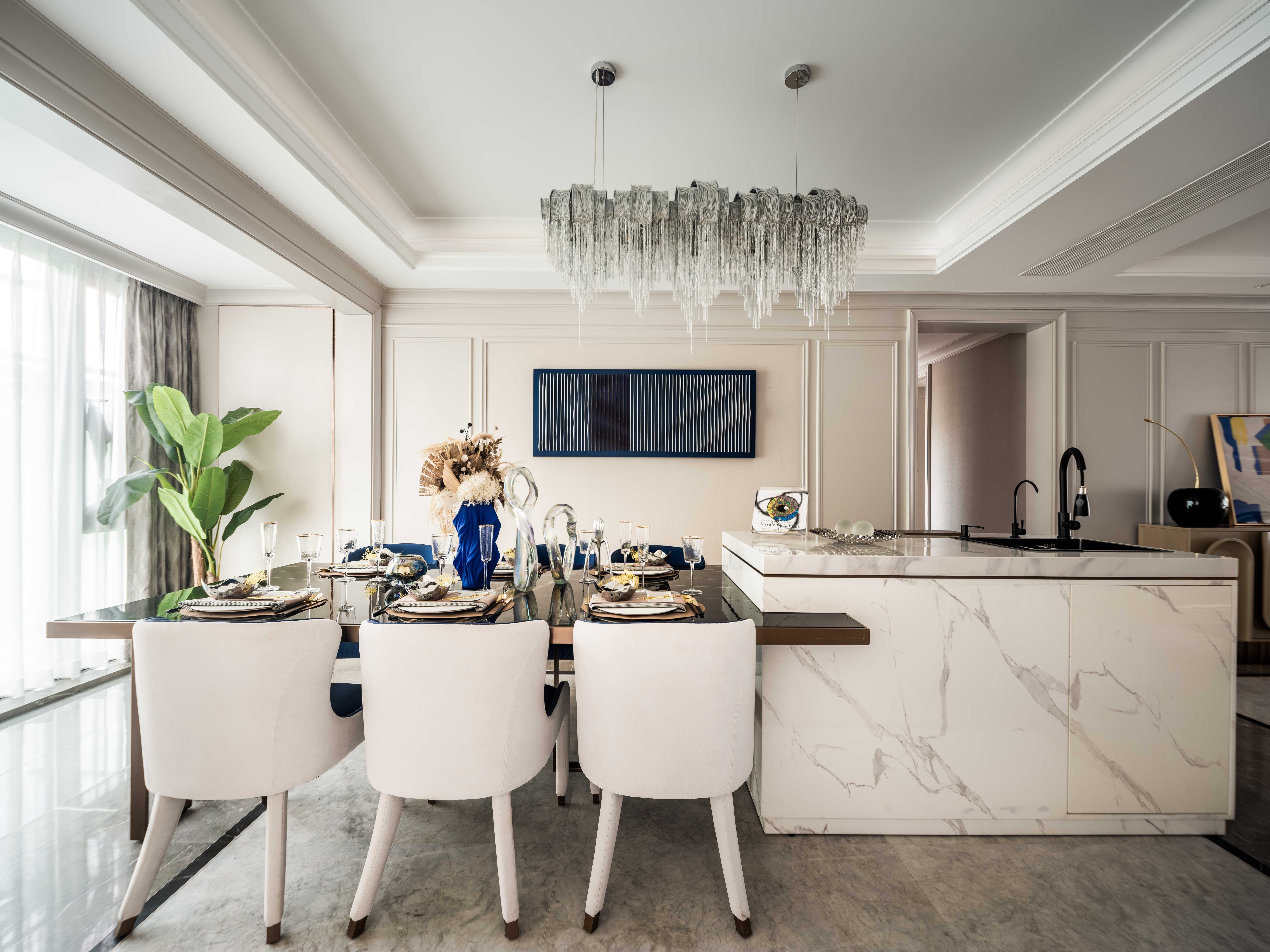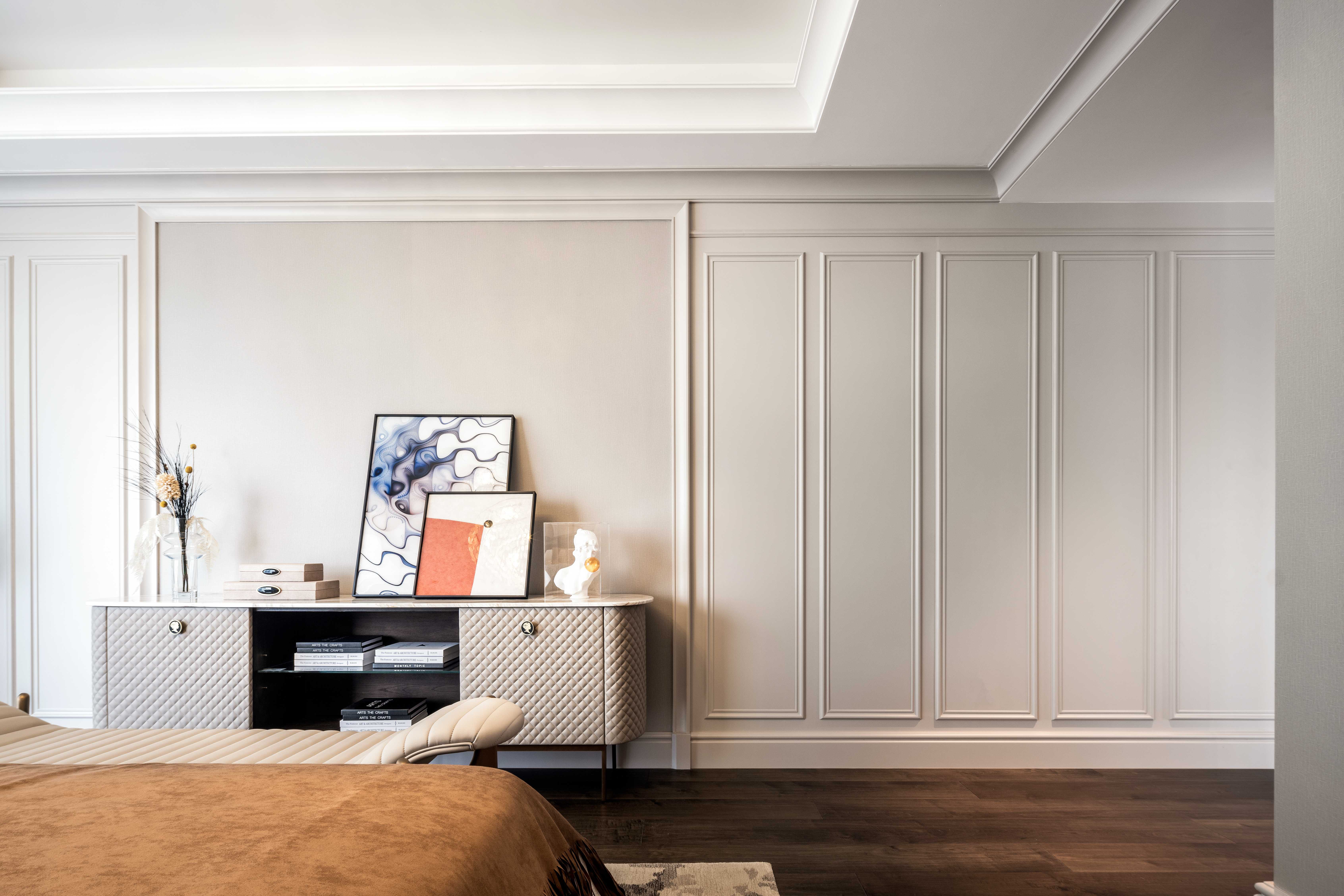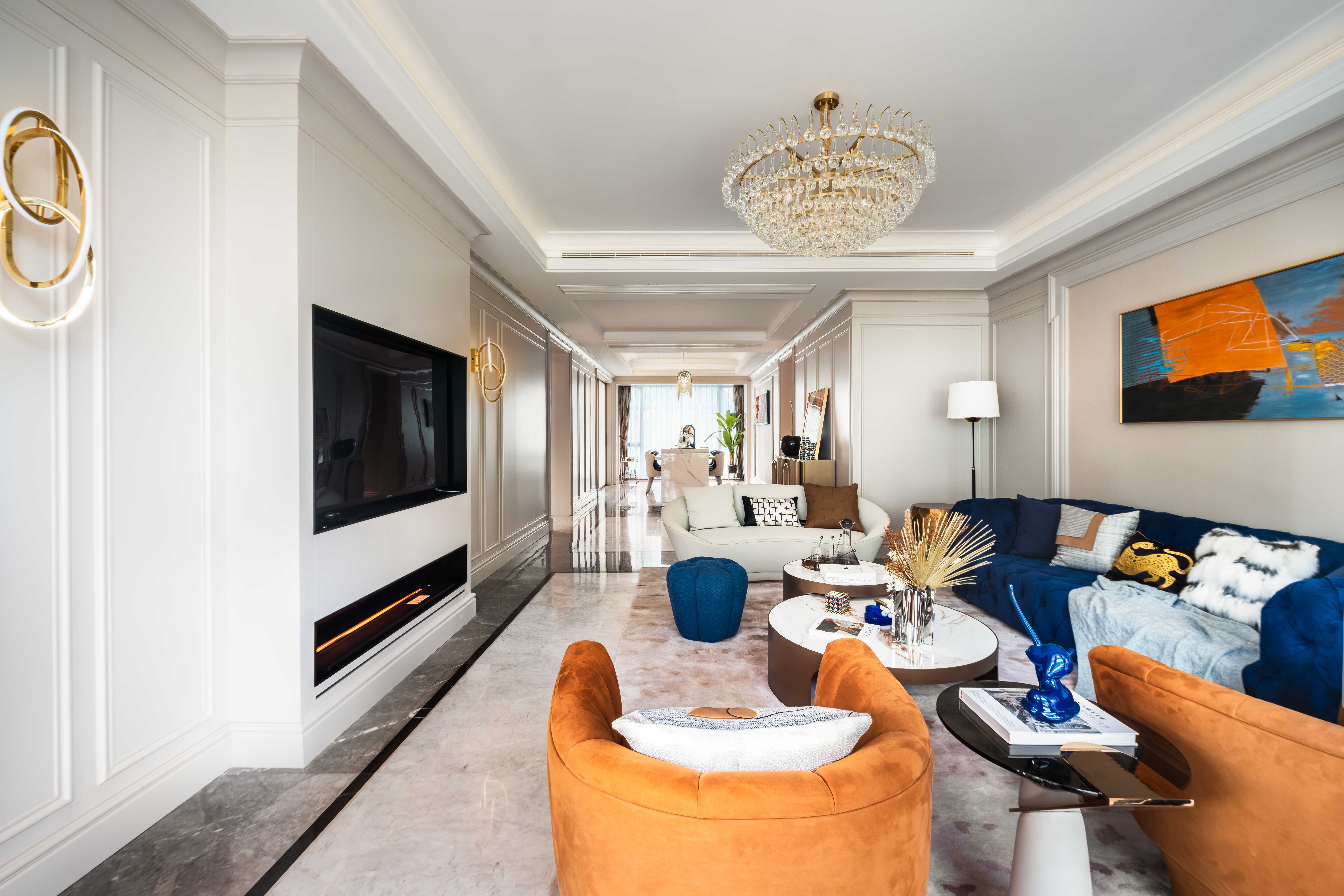 This space uses soft gray and white tones, paired with bright blue and orange furniture, injecting vitality into the classic design. Bold artwork and modern lighting make the entire space look more modern and layered.