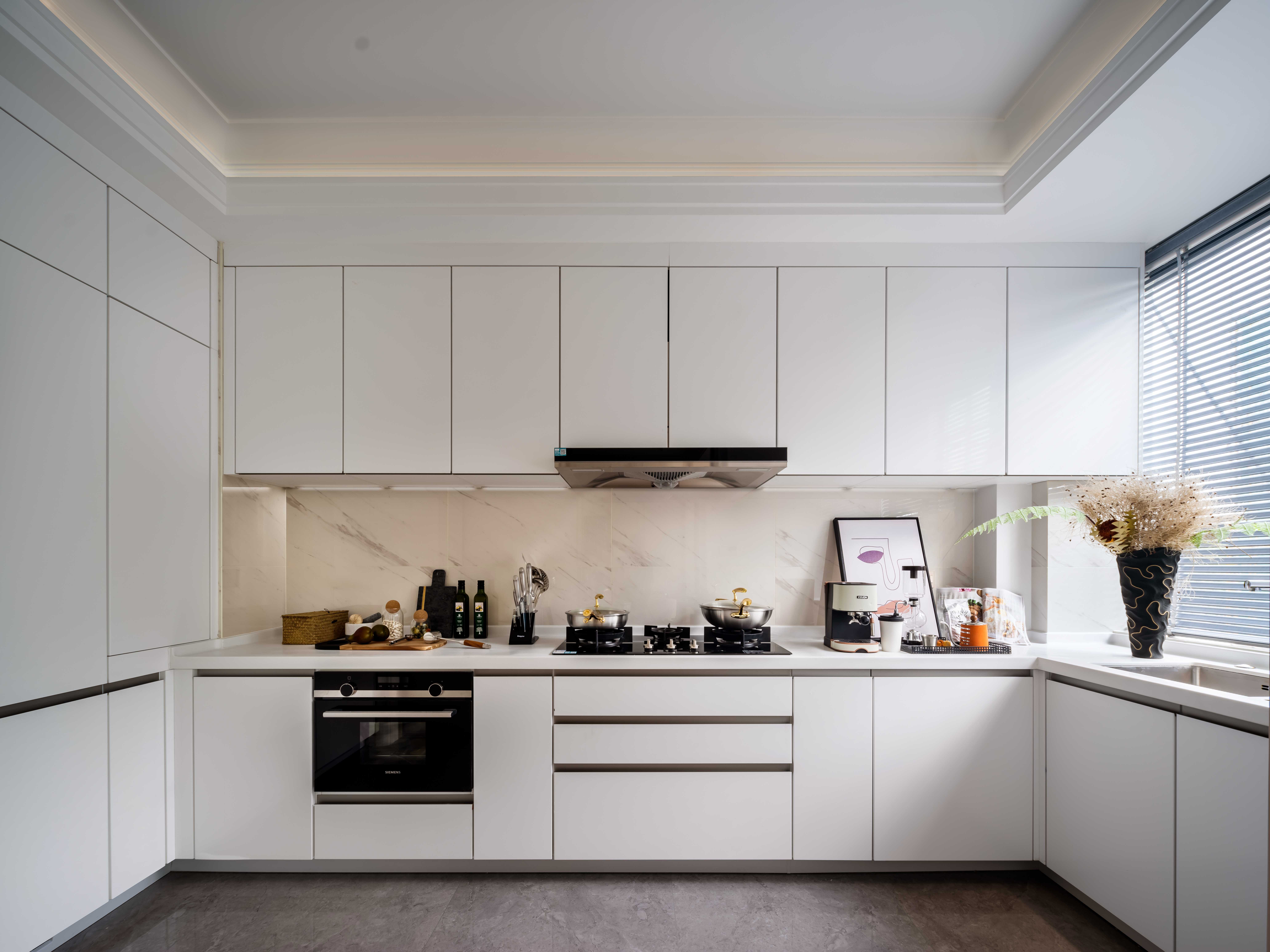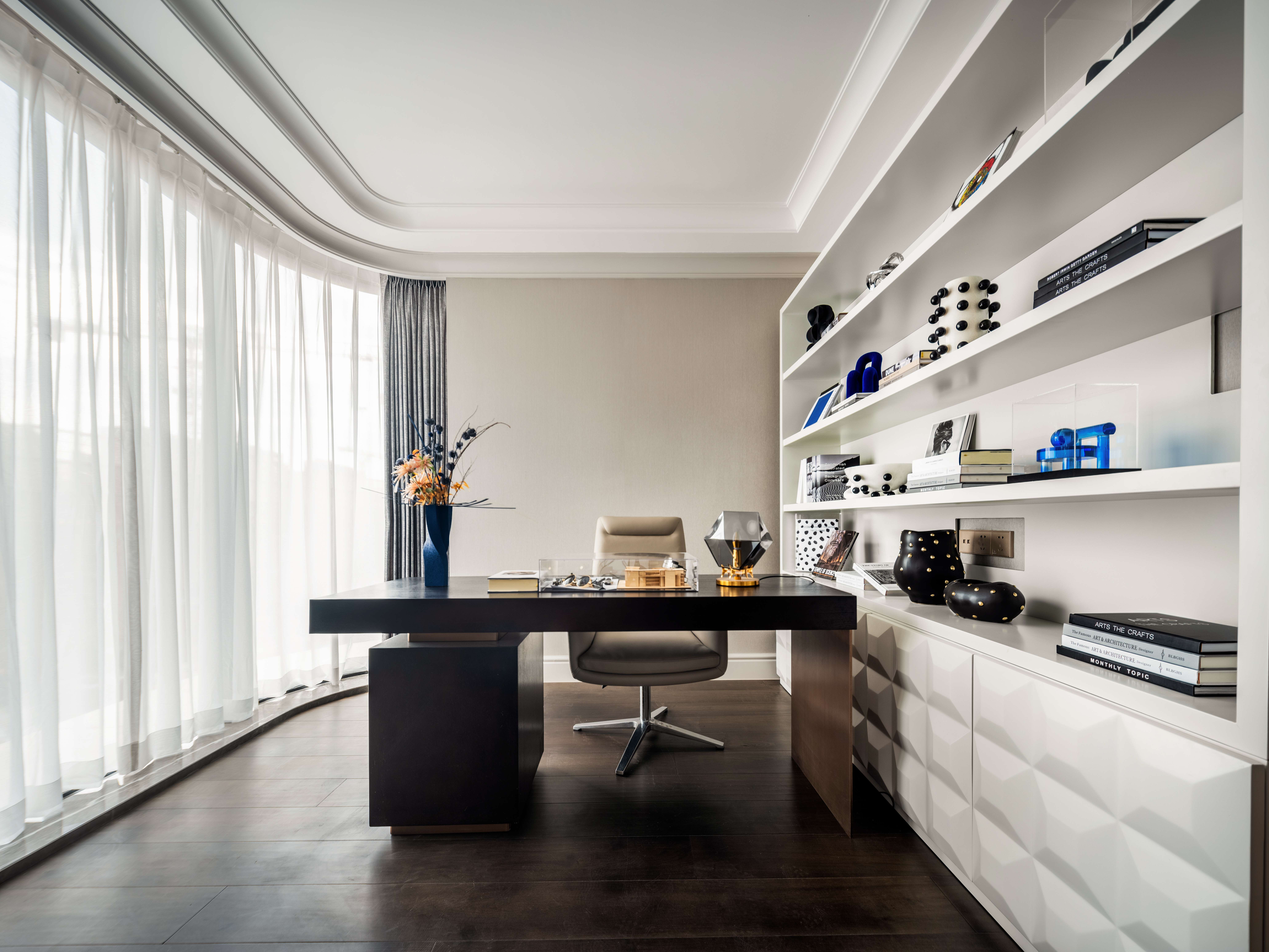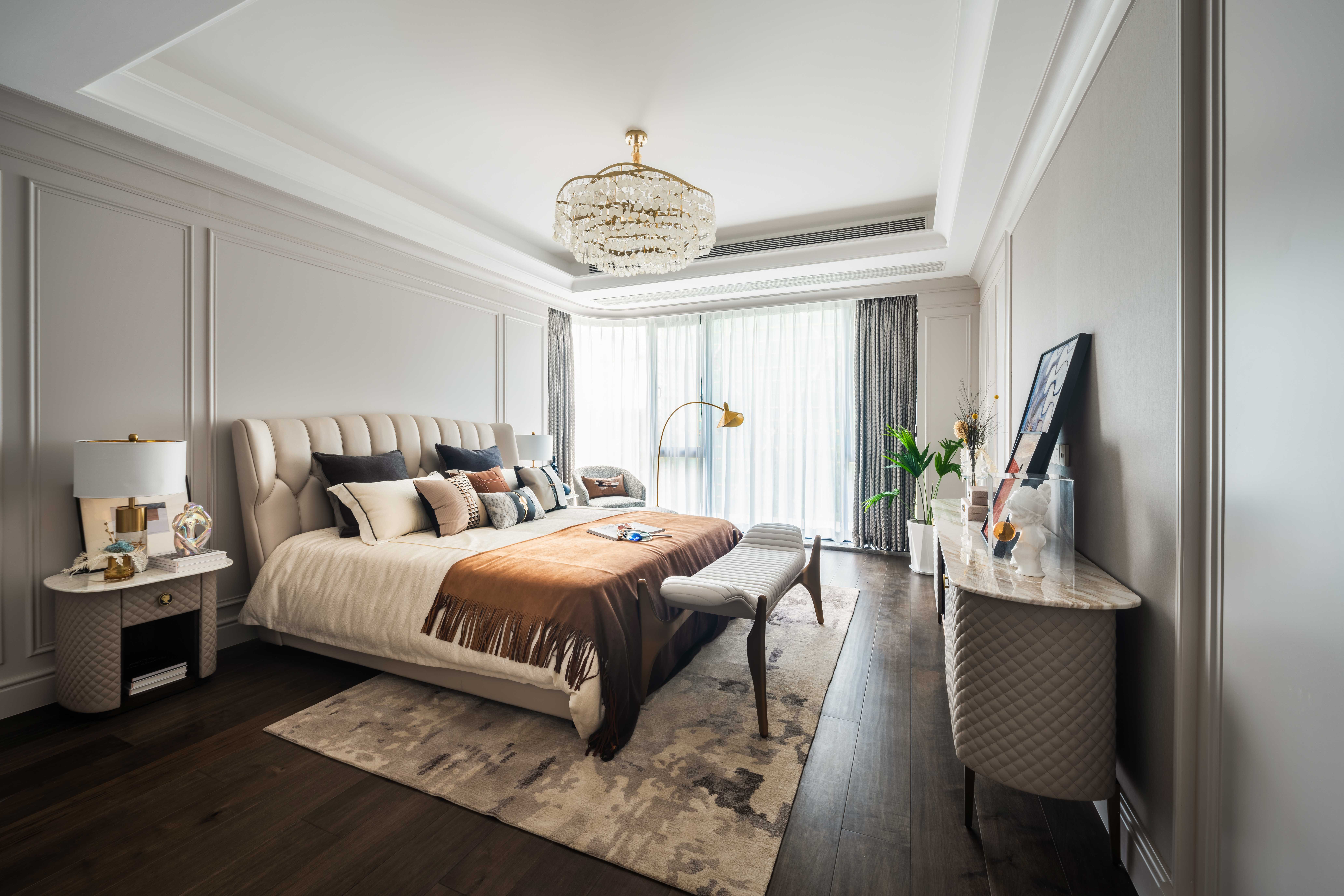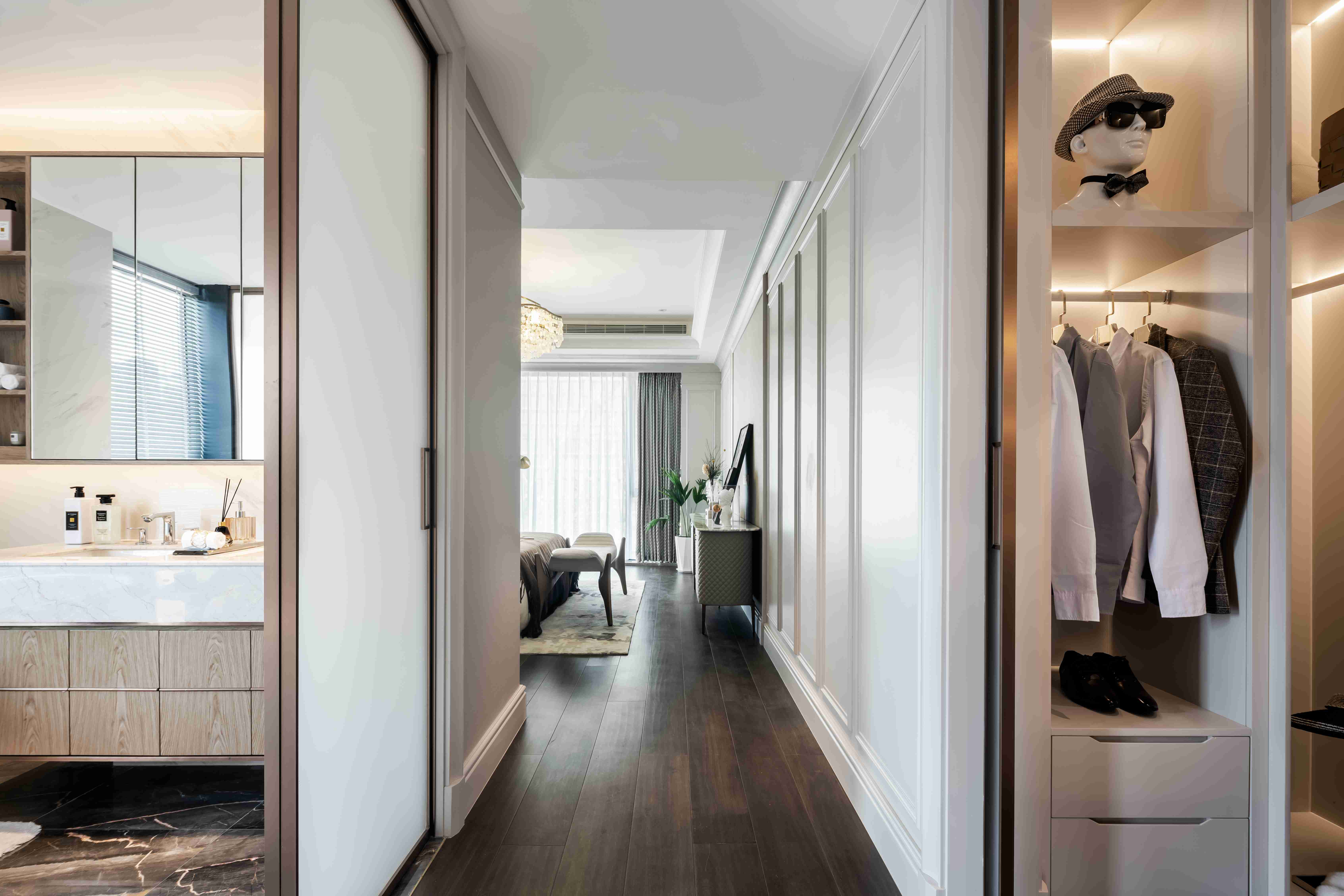 This space uses soft gray and white tones, paired with bright blue and orange furniture, injecting vitality into the classic design. Bold artwork and modern lighting make the entire space look more modern and layered.