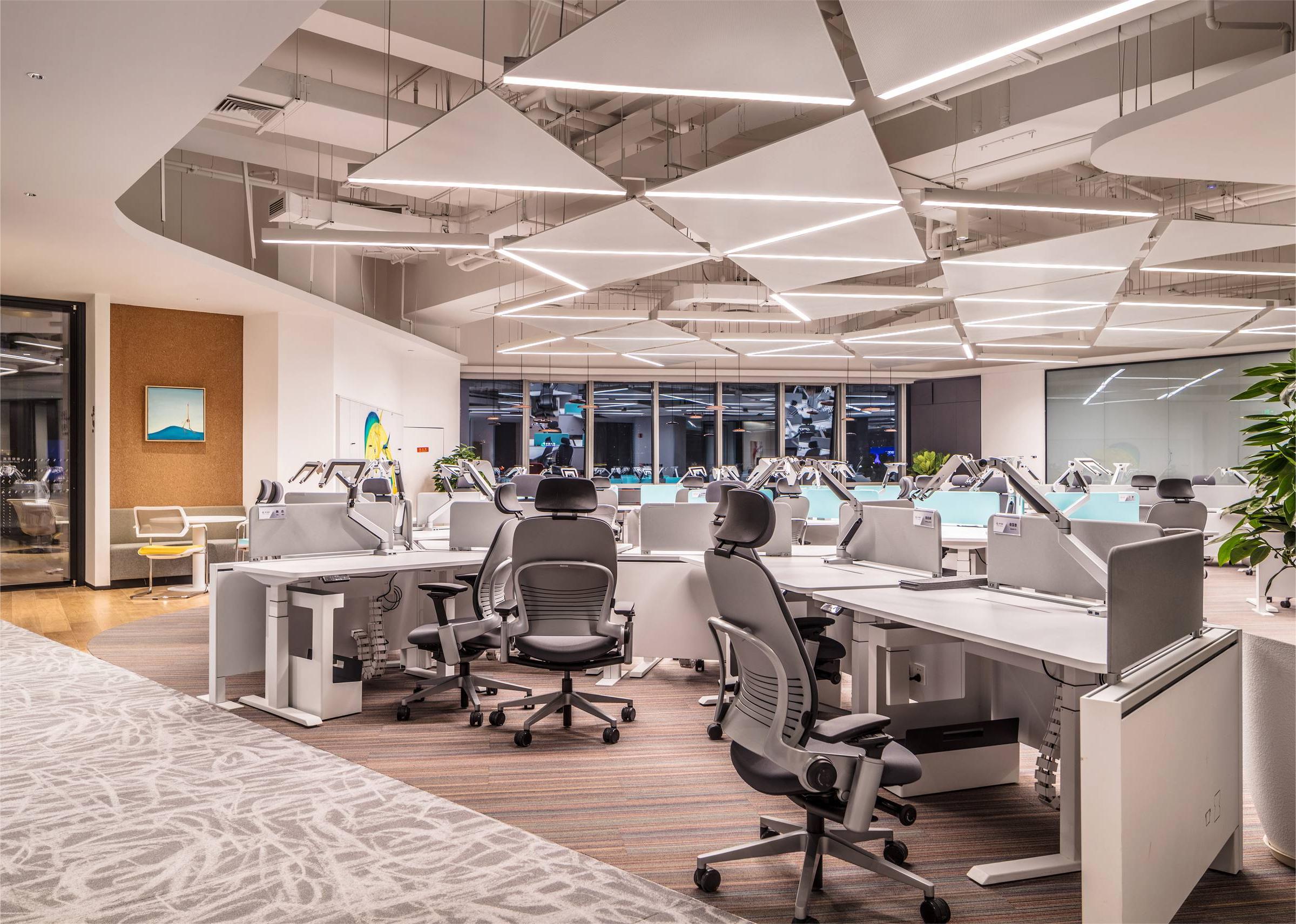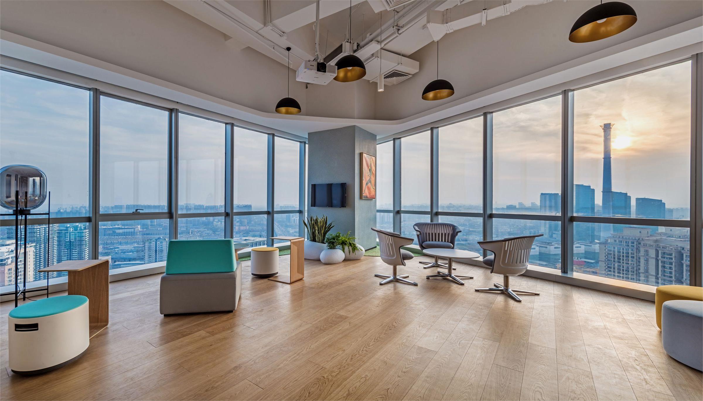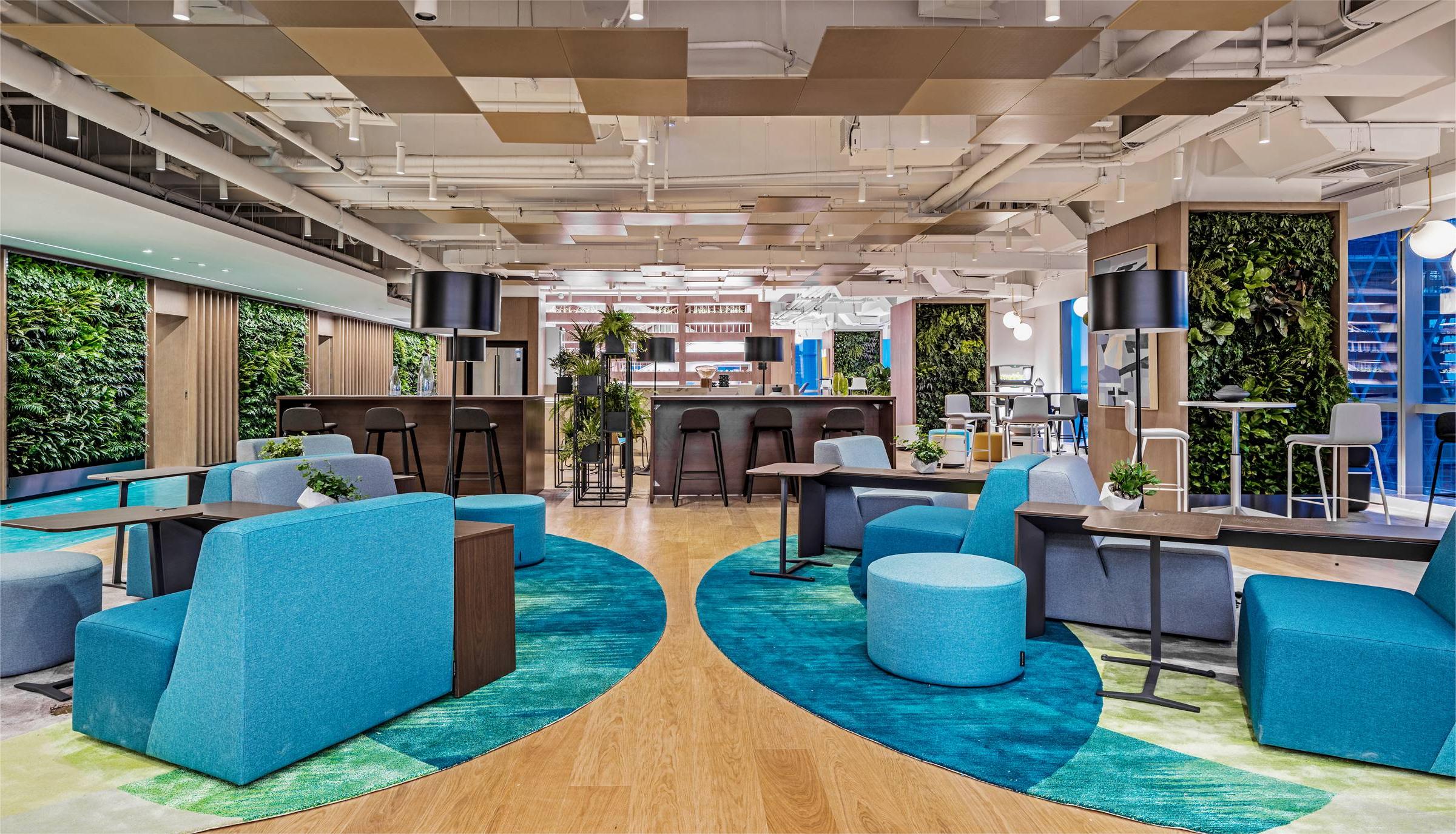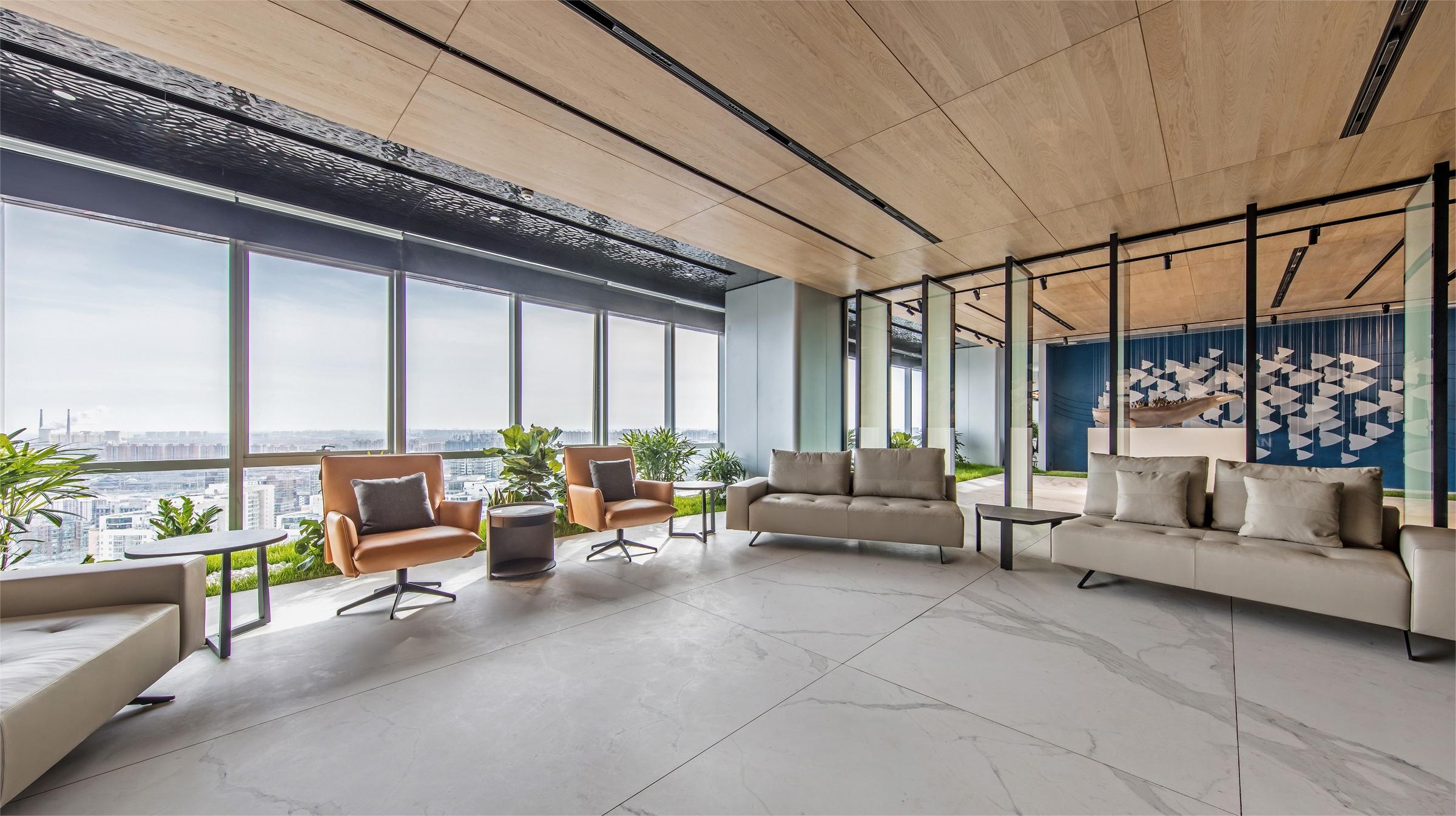 The design style is modern and fashionable. Different colors, materials, and various customized corporate culture elements are used to enrich the overall space effect. The design language is simplified, a large number of green plants are introduced, and art works inspired by marine elements are used.