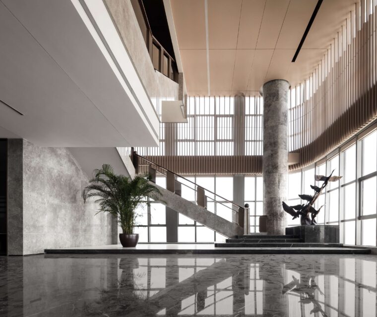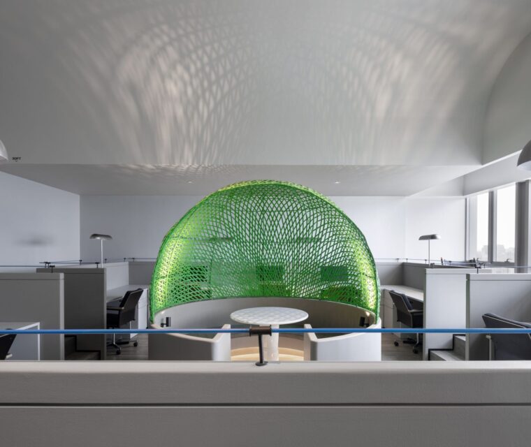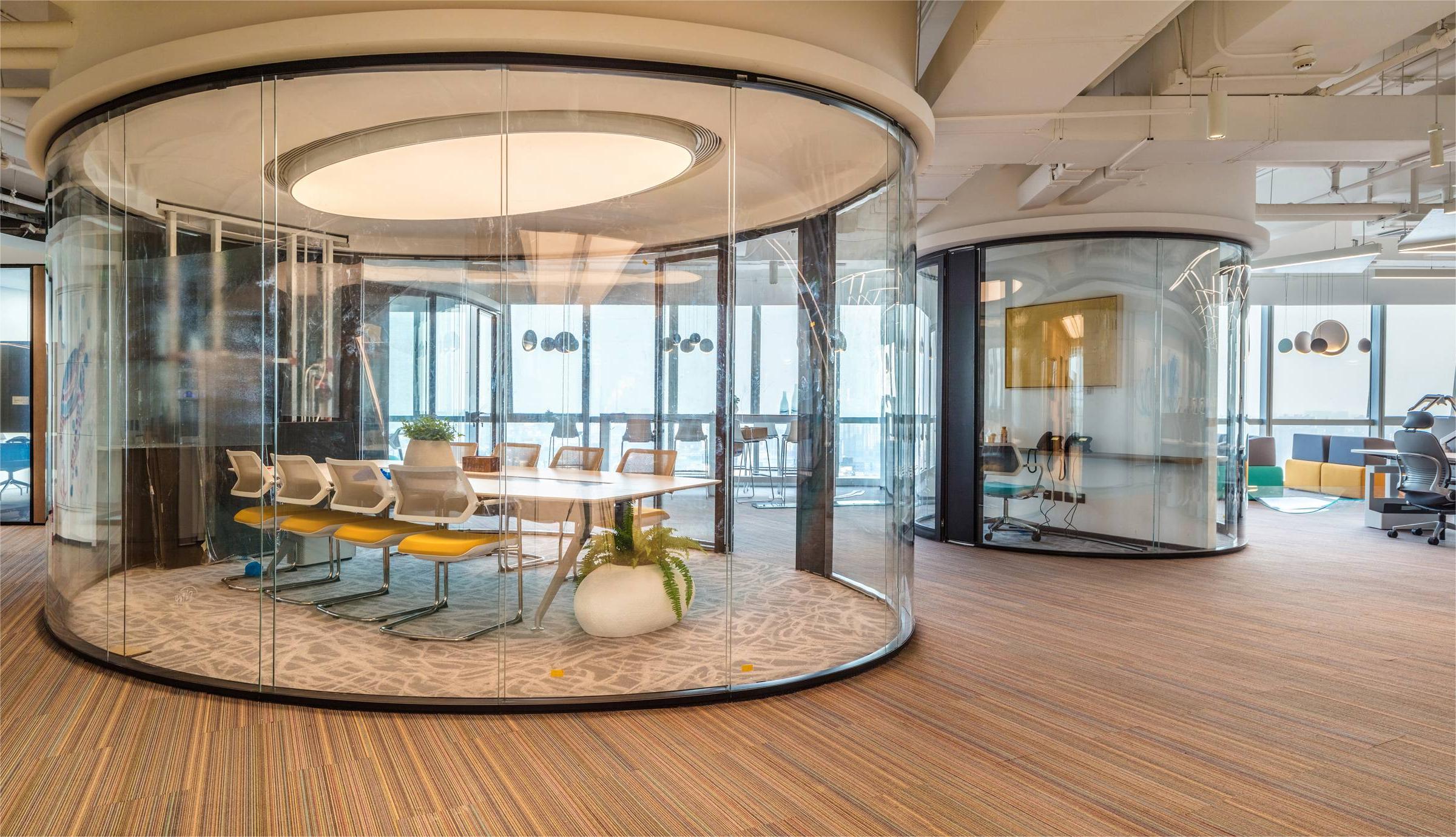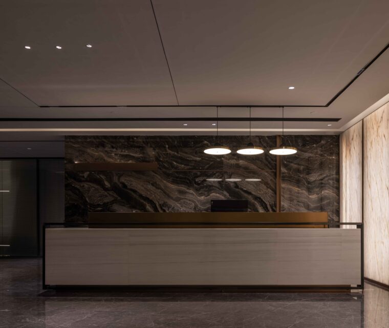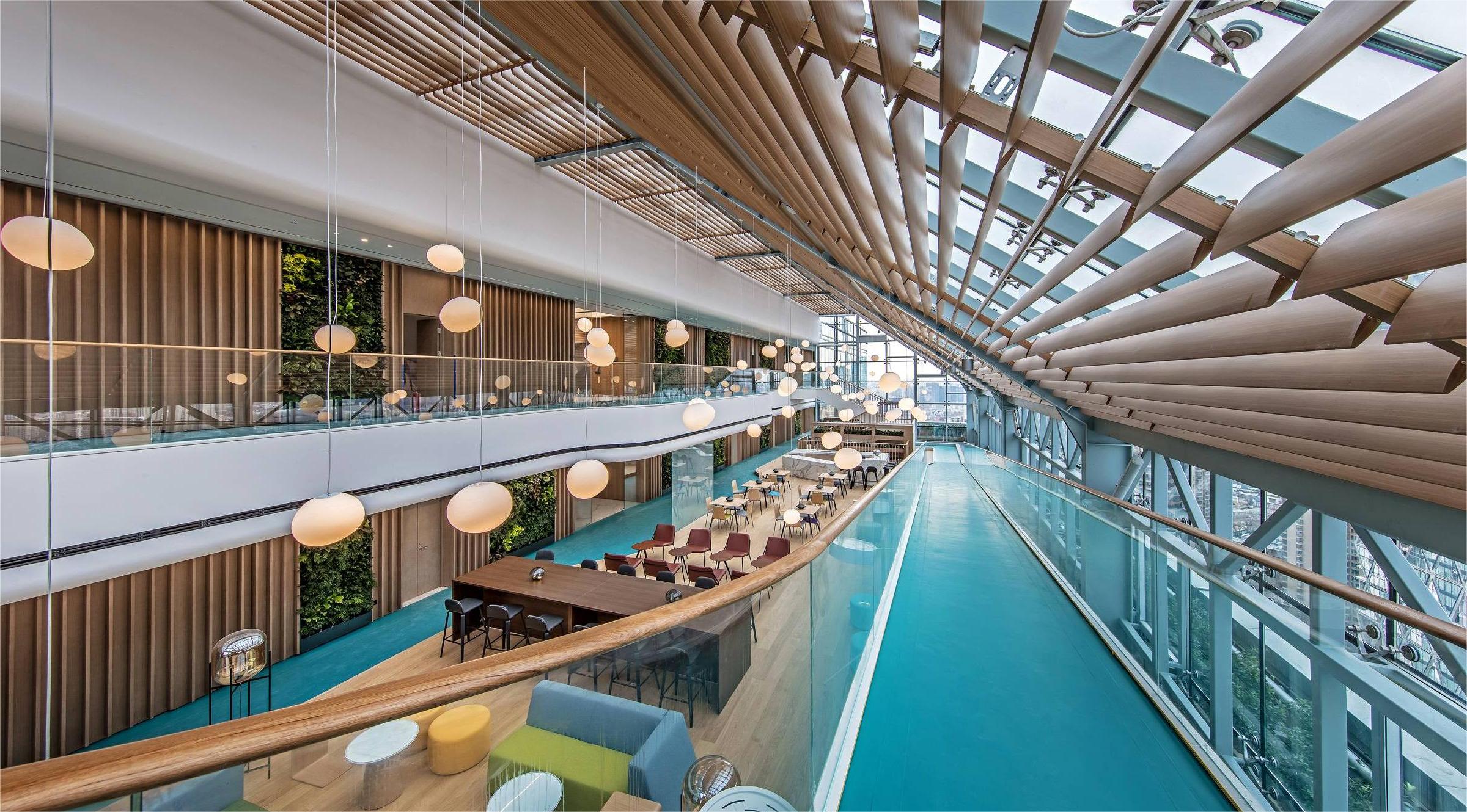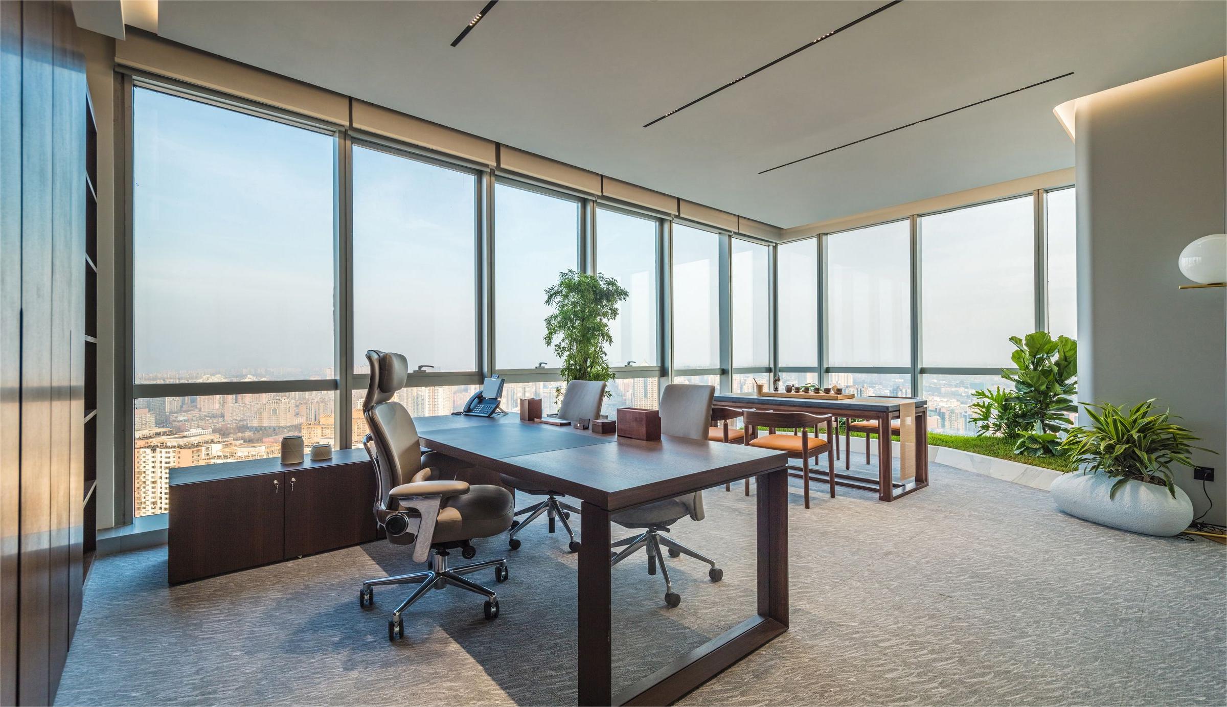 The design style is modern and fashionable. Different colors, materials, and various customized corporate culture elements are used to enrich the overall space effect. The design language is simplified, a large number of green plants are introduced, and art works inspired by marine elements are used.